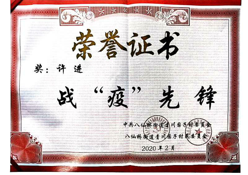 疫情发生后,他第一时间投入防控一线,迅速联系当地防疫服务队,不顾生命安危,于正月初一即刻返回老家青川围子村,服从村委安排,成为一名光荣的大学生志愿者。疫情发生后,他主要负责询问登记过往车辆、宣传讲解防范措施、温馨劝返和安全维护等工作。在此期间,许进同学不仅自己忘我地投入到防控工作中去,还带领其余三名大学生志愿者一起努力,把琐碎的任务细化,做好分工,大大提高了工作效率,成为一名合格的防疫团队“领头人”,荣获战“疫”先锋称号。