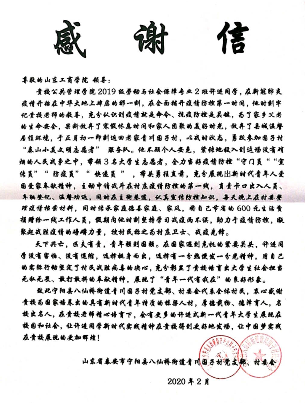 近日,我校收到一封特别的感谢信,这封感谢信来自山东省宁阳县八仙桥街道青川围子村党支部、村委会。信里对我院劳动与社会保障专业1902班大学生志愿者许进同学在疫情防控战期间所做出的付出和贡献表示感谢,同时对我院在立德树人、人才培养方面所作的努力给予了充分认可和肯定。感谢信具体内容如下: